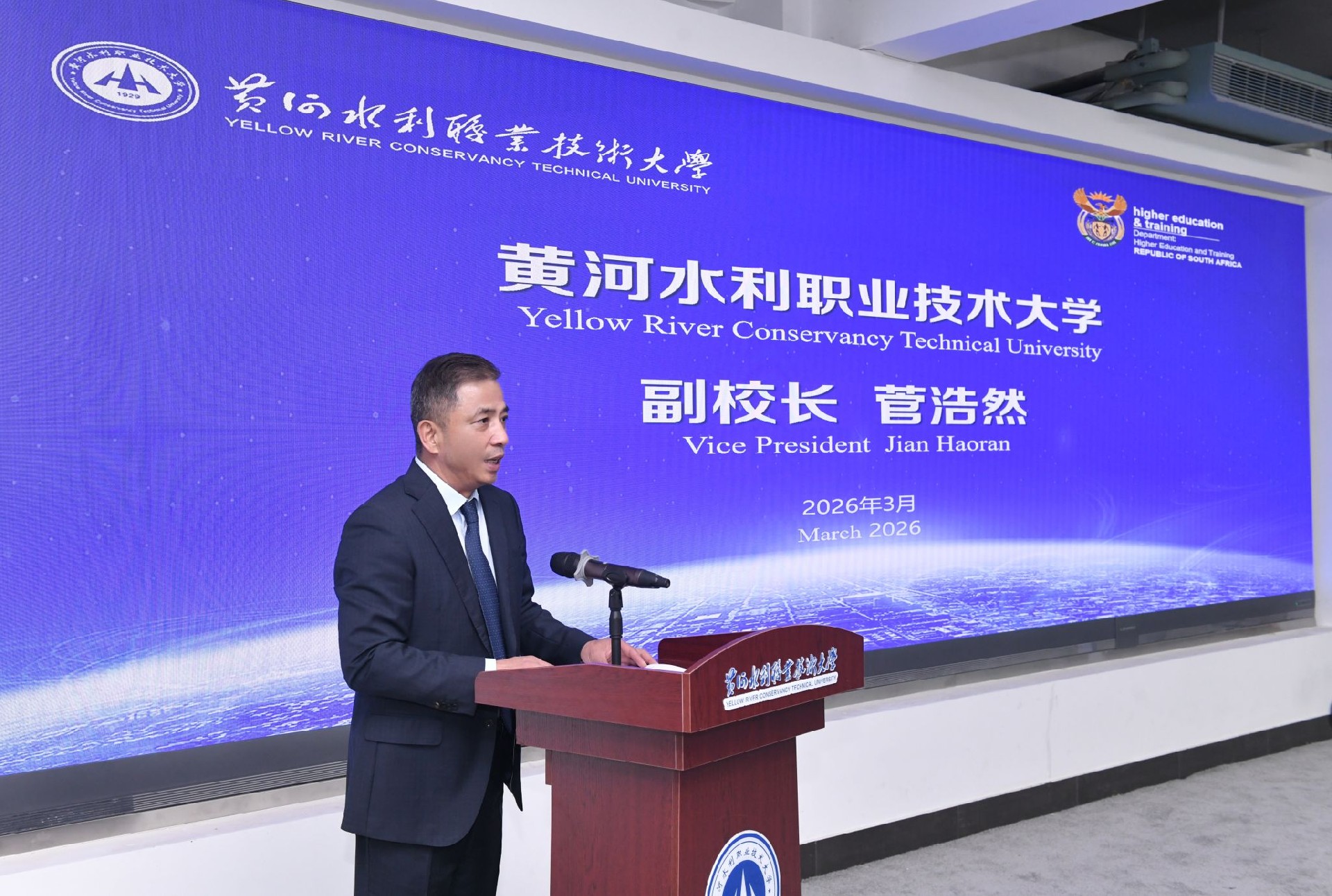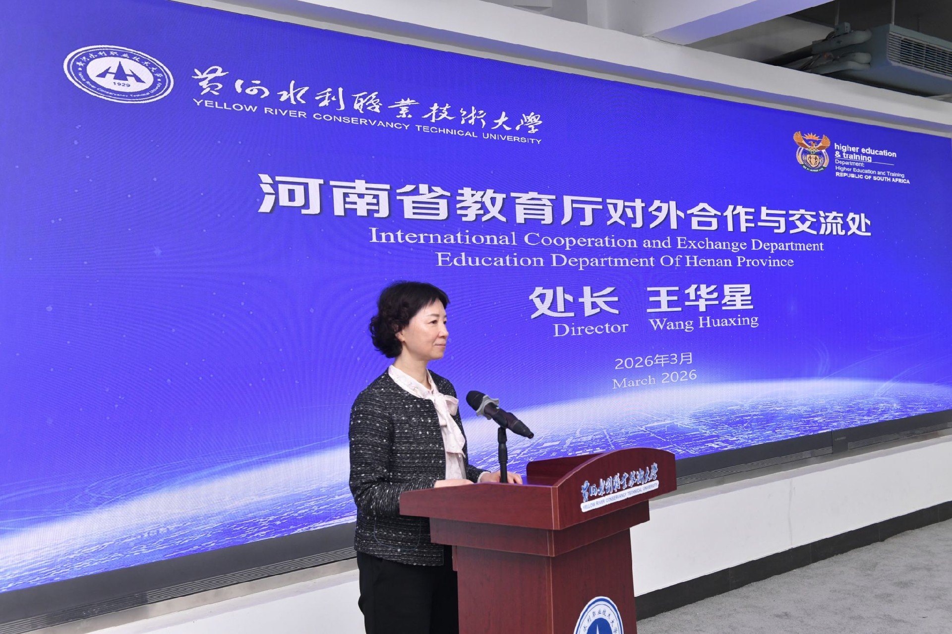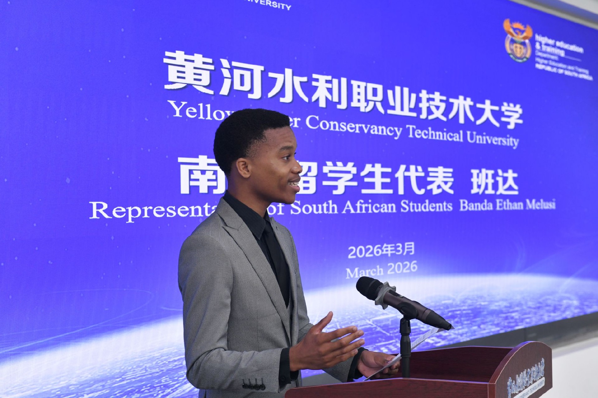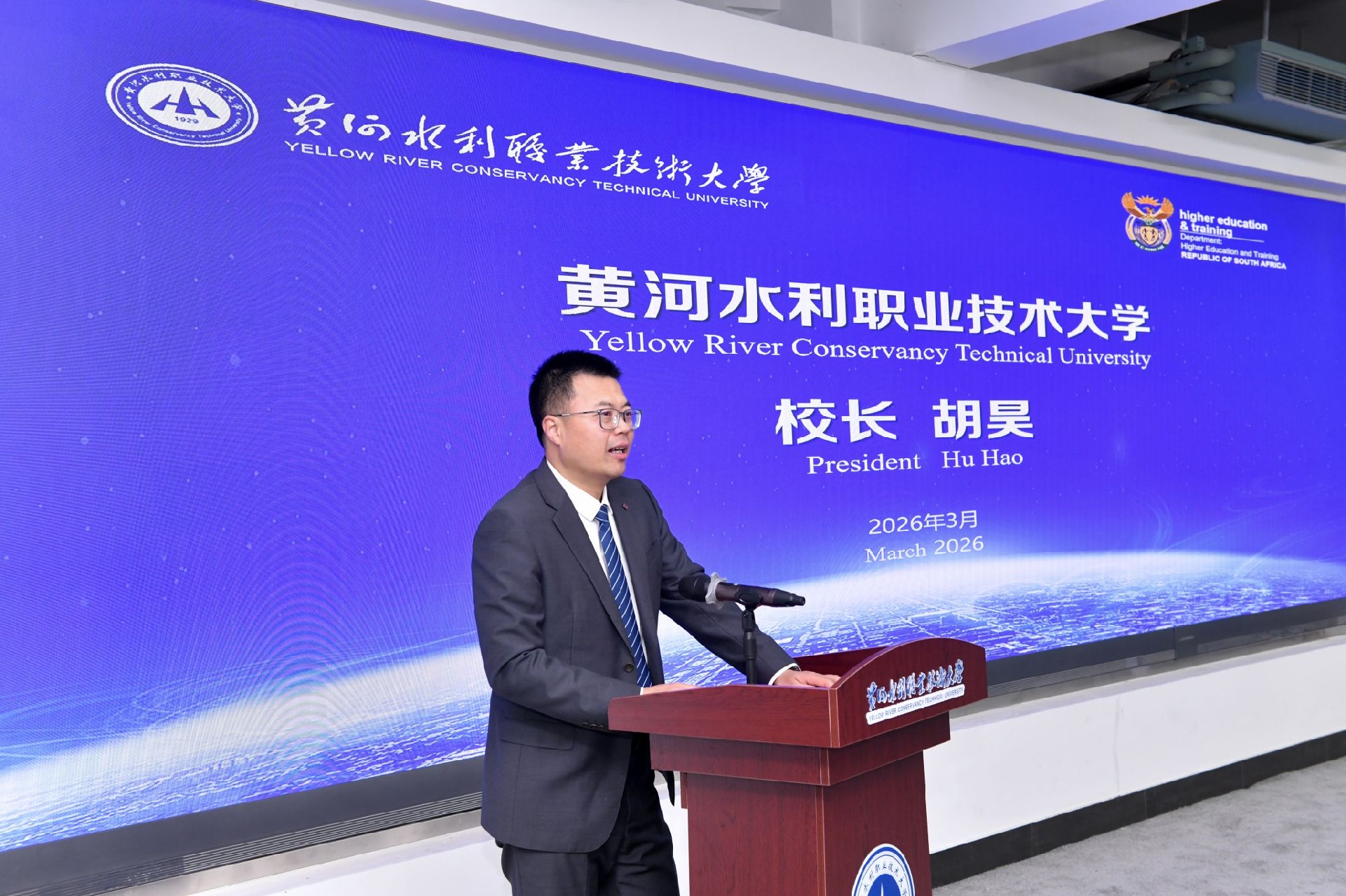 3月26日上午,黄河水利职业技术大学举行南非公派来华留学全额奖学金项目2026级开学典礼。河南省教育厅对外合作与交流处处长王华星,校长胡昊、副校长菅浩然出席典礼,对外联络与合作处、国际教育学院及电气工程学院负责人、教师代表与南非留学生参加。典礼由菅浩然主持。开学典礼现场校长胡昊致辞河南省教育厅对外合作与交流