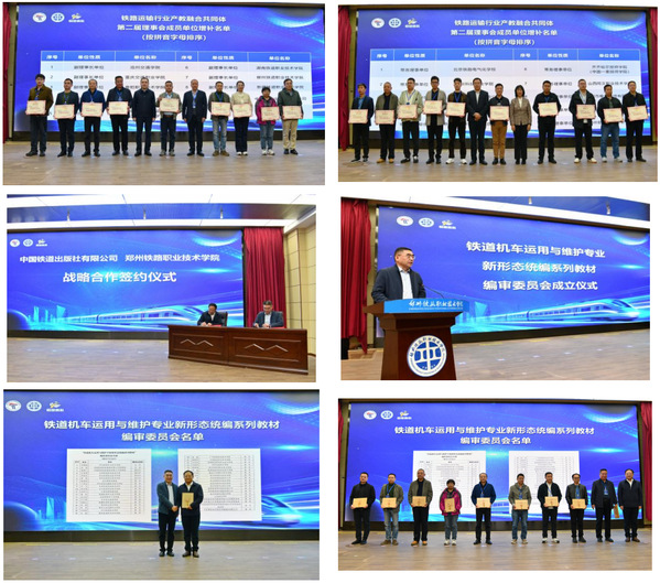 会议期间举行了一系列富有成效的活动。与会领导为9家新增副理事长单位及10家常务理事单位颁发证书;郑州铁路职业技术学院与中国铁道出版社有限公司签署战略合作协议;在教材建设启动仪式上,杨新阳介绍了教材编审委员会的成立背景,与会嘉宾为主任委员、委员代表颁发聘书。这些环节紧凑有序,将会议氛围推向高潮,充分彰显了共同体推进产教融合的务实举措。