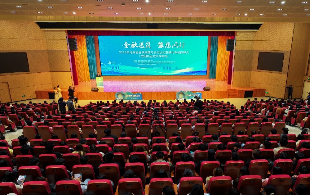 10月18日上午,河南省2025年金秋招聘月豫北专场启动仪式在安阳职业技术学院隆重举行。安阳市常务副市长薛崇林,河南省人社厅二级巡视员李宏灿,安阳职业技术学院党委书记王保安,党委副书记陈海顺,党委委员、副院长付银生,党委委员、纪委书记岳路,和安阳市五县四区、驻安各高校领导50多人和1000多名学生参加,仪式由人社局李涛主持。