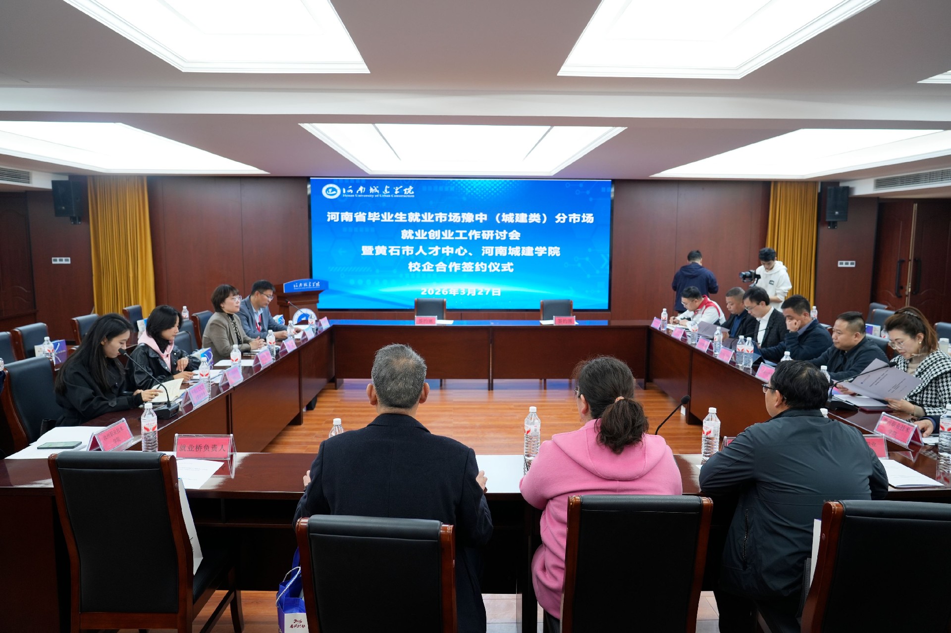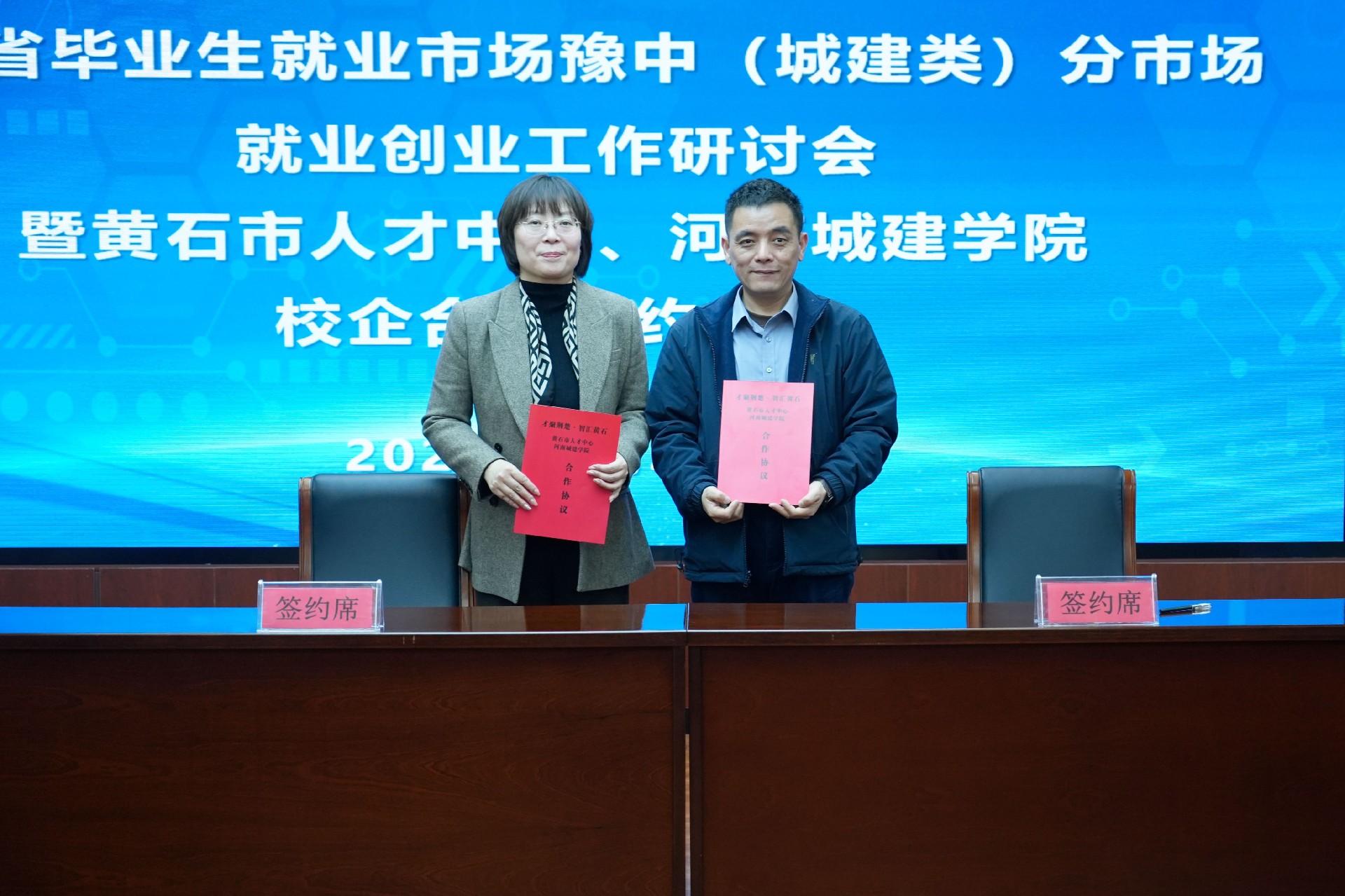 双选会当天,学校在行政楼五楼会议室举办了豫中高校分市场就业创业工作座谈会,来自豫中地区的14所兄弟院校负责人参加座谈会。会上,河南城建学院与黄石市人才中心举行校企合作签约仪式,共同搭建人才培养与就业服务平台,深化产教融合、校企协同育人。