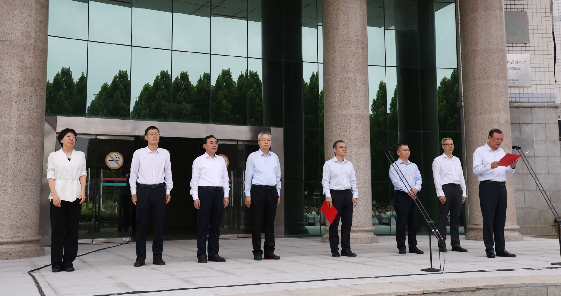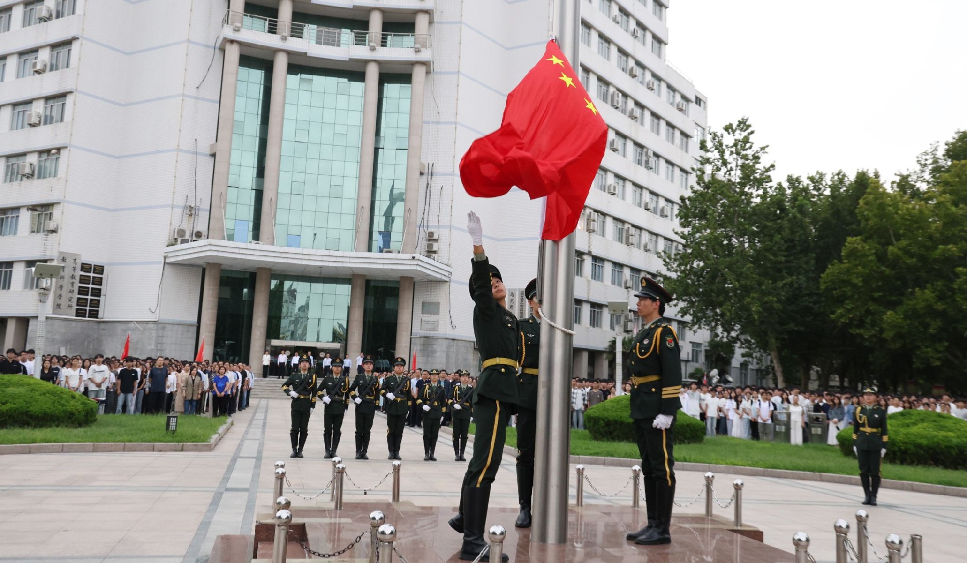 7时整,伴随着雄壮的国歌,英姿飒爽的国旗护卫队迈着整齐有力的步伐护送五星红旗走向升旗台。随着五星红旗冉冉升起,师生们唱国歌、行注目礼,现场氛围庄严神圣。