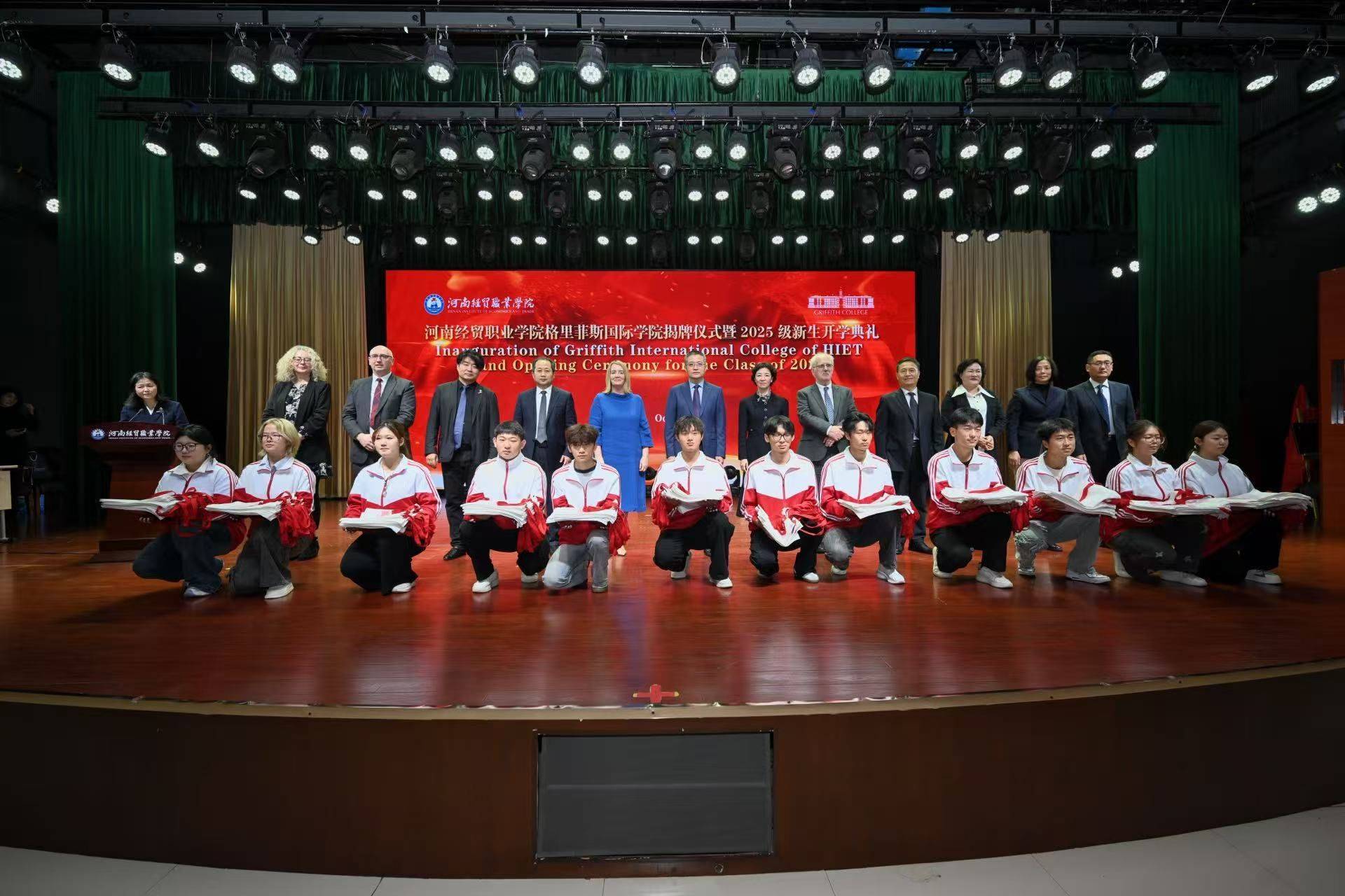 在全体师生的共同见证下,参会领导共同为“河南经贸职业学院格里菲斯国际学院”揭牌,现场掌声雷动。随后,参会领导向2025级新生代表发放入学礼包并合影留念。