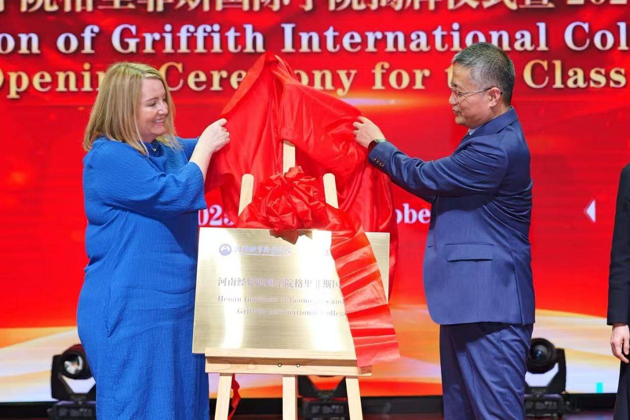 10月14日下午,河南经贸职业学院格里菲斯国际学院揭牌仪式暨2025级新生开学典礼在1406报告厅举行。爱尔兰驻华大使馆商务参赞马柯娜、爱尔兰教育推广署高级市场顾问杨杰、爱尔兰格里菲斯学院学术副校长托马斯·麦克盖根、外事副校长凯文·盖根等爱方嘉宾,河南省人民政府外事办公室副主任李冰、河南省教育厅副厅长杨光、河南