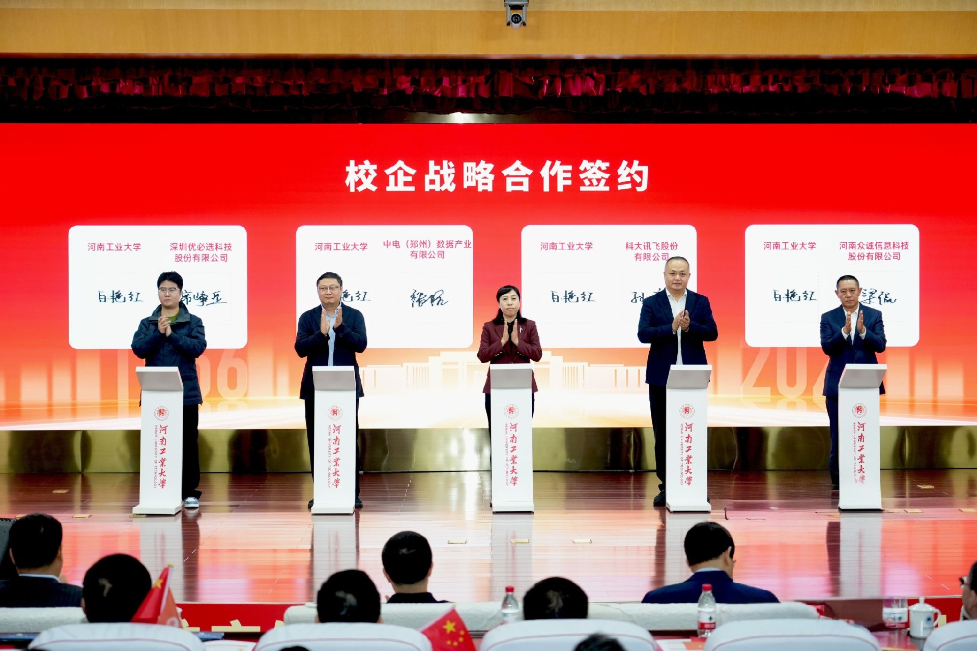 随后,学校与科大讯飞股份有限公司等多家企业进行校企战略合作签约和校企横向科研项目合作签约。签约仪式后,河南省优青、化学化工学院朱利敏教授作为教师代表发言,她表示将立足本职岗位,传承和弘扬“工大精神”,为建设特色鲜明的一流工业大学贡献自己的全部智慧和力量。