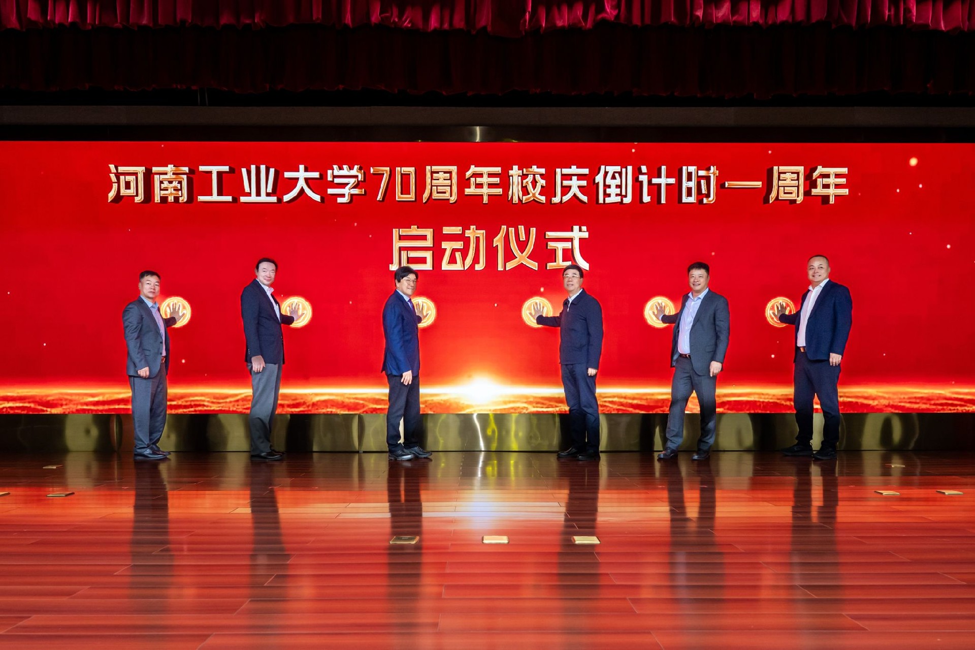 校领导、校友代表、合作企业代表共同按下70周年校庆一周年倒计时启动手印,河南工业大学70周年校庆倒计时365天正式开启。
