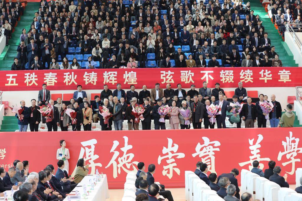 大会上,青年师生代表为50周年校庆献词,深情朗诵王文鹏教授所作长诗《光荣与梦想》,礼赞母校辉煌,讴歌峥嵘岁月。校友和师生代表向老领导、老教师代表献花,深情致敬师长前辈,感恩和铭记他们为学校发展作出的卓越贡献。