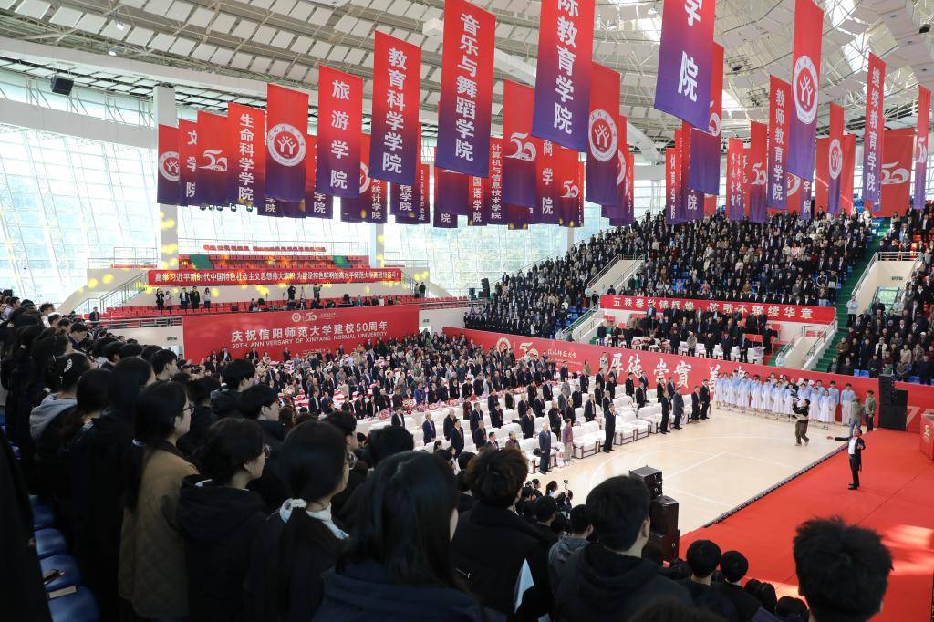 五秩春秋铸辉煌,弦歌不辍续华章。10月28日,校园内彩旗飘扬,宾客盈门、高朋满座,信阳师范大学建校50周年高质量发展大会在体育馆隆重举行。学校师生员工、校友和关心支持学校发展的各界人士欢聚一堂,共庆五十华诞,共襄发展盛举,共谋发展蓝图。