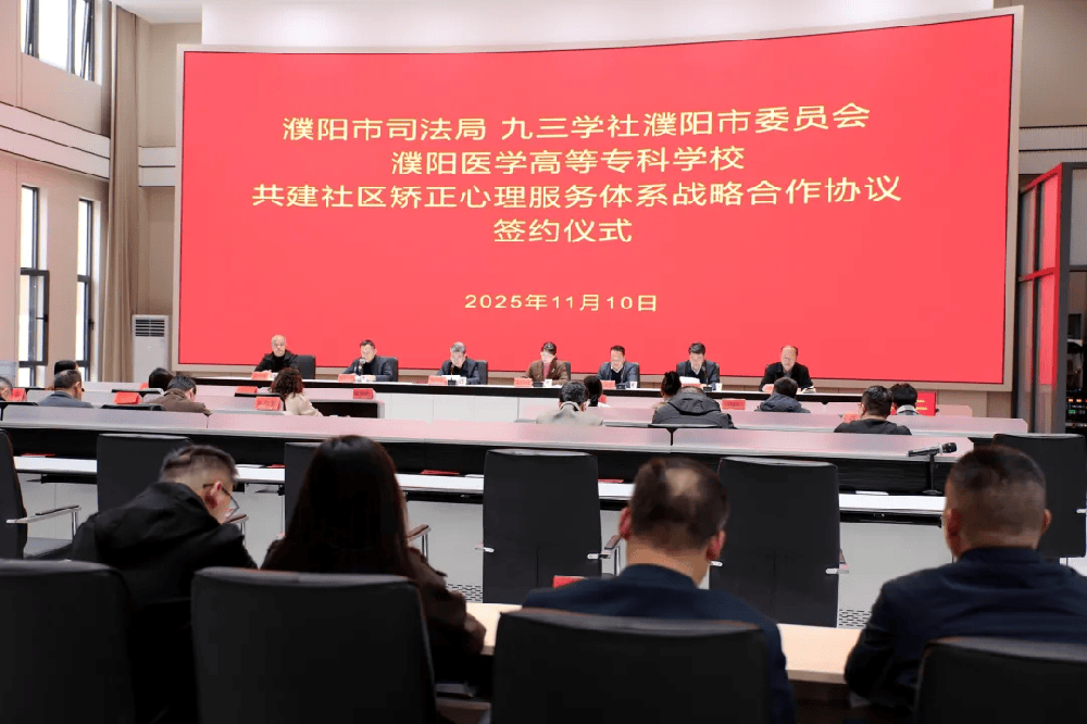 2025年11月10日,濮阳市司法局、九三学社濮阳市委员会、濮阳医学高等专科学校三方战略合作签约仪式在华龙区司法局成功举行,标志着濮阳市社区矫正心理服务体系共建工作正式启动。此次跨部门、跨领域的强强联合,旨在为社区矫正对象构建一道坚实的“心理防线”,助力其重塑健康心态、顺利回归社会,是濮阳医专深化校地合作、履行社会责任的重要实践。