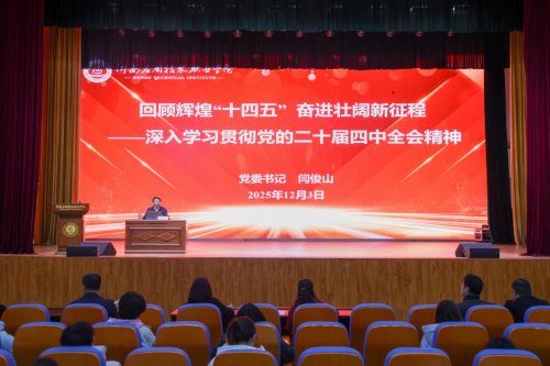 12月3日,河南应用技术职业学院党委书记闫俊山以《回顾辉煌“十四五” 奋进壮阔新征程》为题,为全校师生宣讲党的二十届四中全会精神。党委副书记、工会主席陈君丽及部分师生代表参加现场学习。