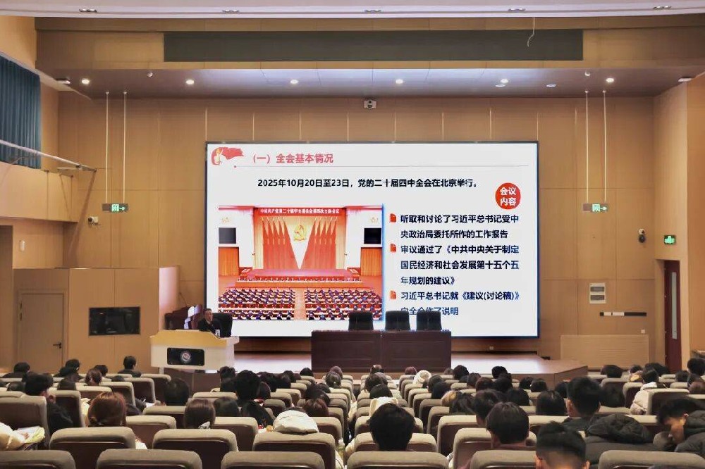 王庆志从国家五年规划的战略高度和深远影响切入,生动阐述了党的二十届四中全会的召开背景和重大意义。全会站在“十四五”规划收官与“十五五”规划谋篇布局的历史交汇点上,审议通过的《中共中央关于制定国民经济和社会发展第十五个五年规划的建议》,不仅绘就了国家未来五年的宏伟发展蓝图,更直接关系到每一位青年学子的成长成才,激励同学们要胸怀“国之大者”,找准自身定位。
