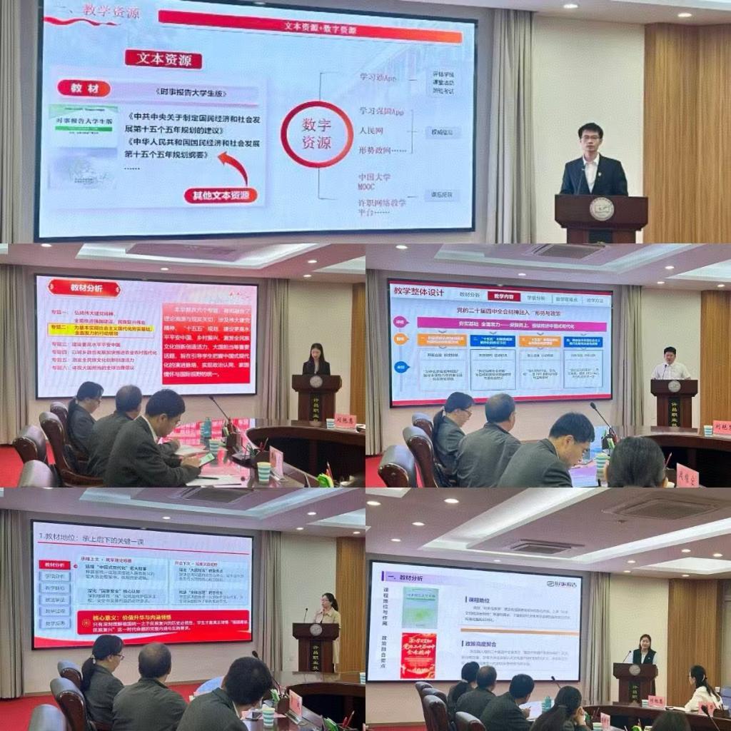 说课展示环节,许昌职业技术学院青年教师徐恒亮、许昌学院谢雨欣、中原科技学院周桂焱、漯河医学高等专科学校张亚东、许昌电气职业学院闫艺璇五位教师依次登台展示。他们紧扣教学目标设定、学情精准分析、教学内容整合、教学方法创新及融入路径优化等关键环节,呈现出风格多样、案例鲜活的说课内容,充分展现了学校及兄弟院校思政课教师扎实的教学功底与创新的教学思维。