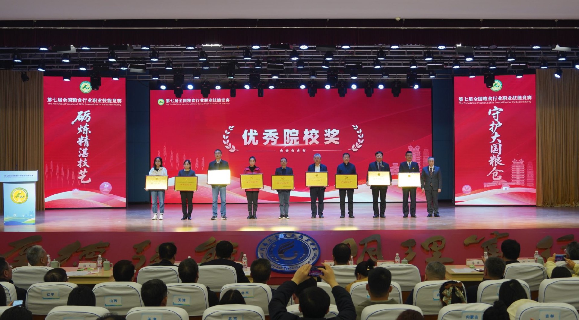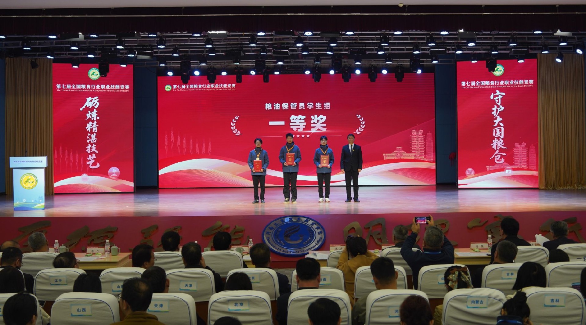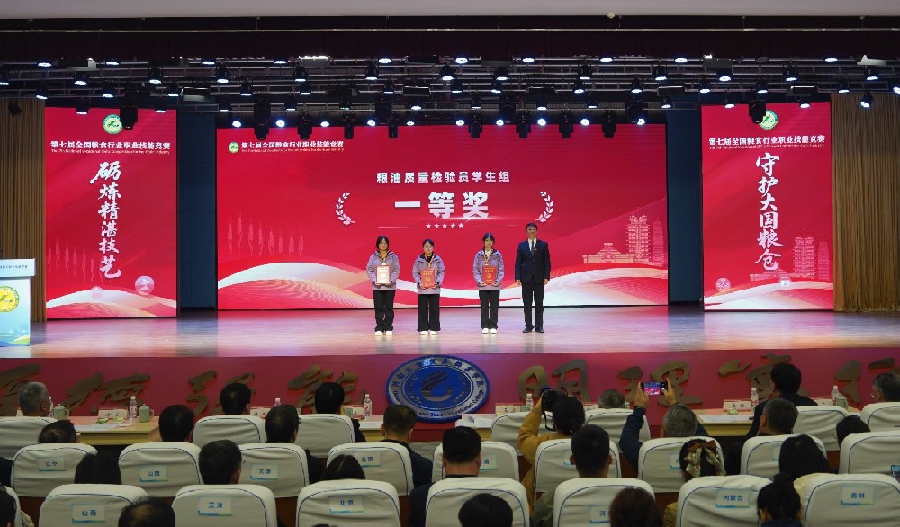 第七届全国粮食行业职业技能竞赛于11月4日至6日在郑州举行。国家发展改革委党组成员、国家粮食和物资储备局党组书记、局长刘焕鑫出席开幕式并讲话;河南省副省长李酌,中华全国总工会书记处书记、党组成员张新武出席开幕式并致辞;河南工业大学党委书记刘志军、副校长赵仁勇参加了开幕式。颁奖现场在这场汇聚全国粮食行业精