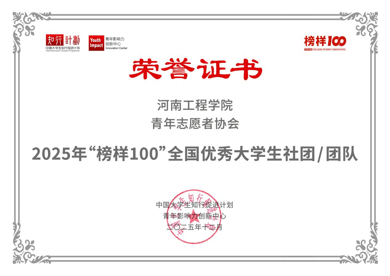 近日,由大学生知行计划和青年影响力创新中心联合发起的2025年“榜样100”全国优秀大学生社团及团队榜单(第二批)正式揭晓,该榜单旨在表彰在各项活动中表现出色的社团和团队。河南工程学院社采缤纷团队、青年志愿者协会、黑苹果青年社团三个优秀学生团队,经过严格的评选过程,从全国376所高校的1320支团队中脱颖而出,成功入选“榜样100”全国优秀大学生社团/团队。