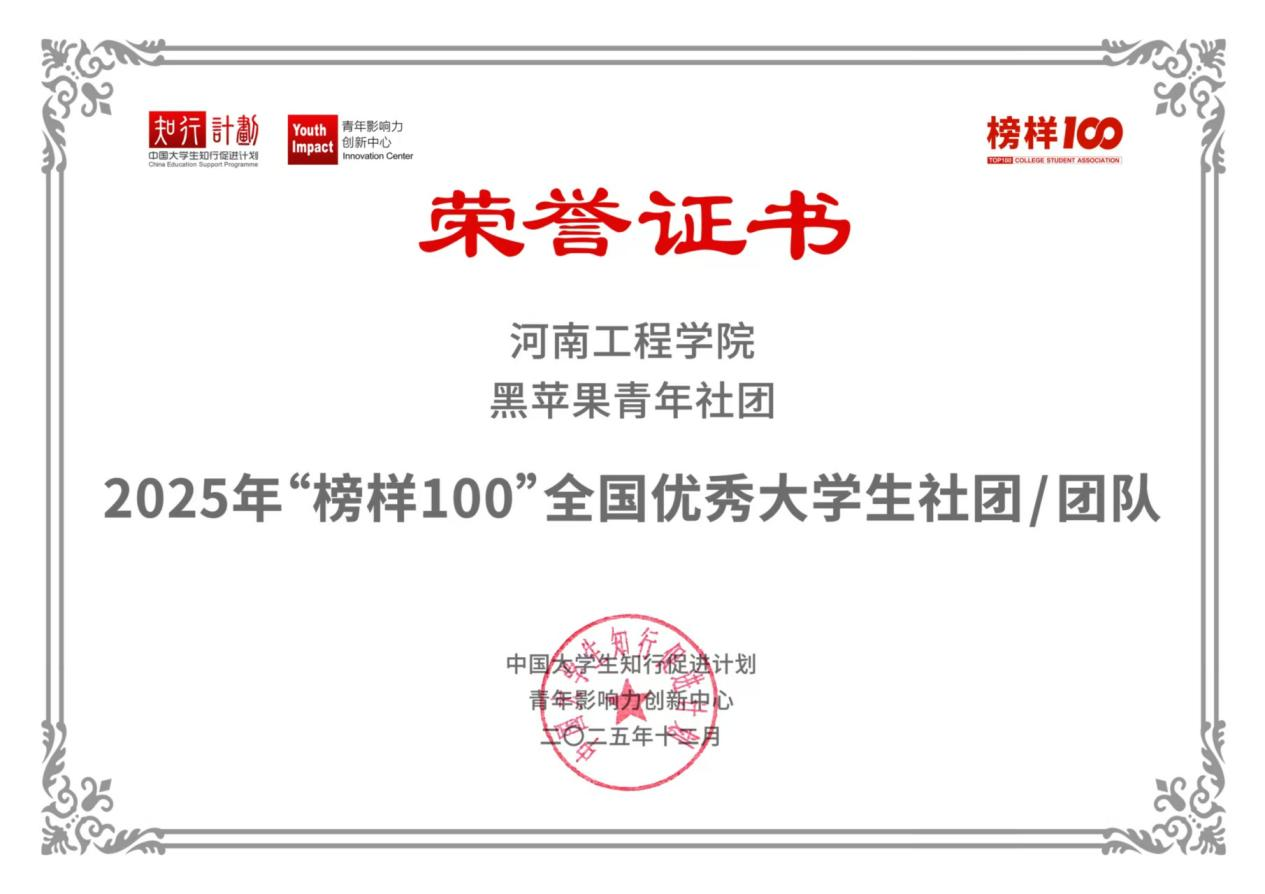 近日,由大学生知行计划和青年影响力创新中心联合发起的2025年“榜样100”全国优秀大学生社团及团队榜单(第二批)正式揭晓,该榜单旨在表彰在各项活动中表现出色的社团和团队。河南工程学院社采缤纷团队、青年志愿者协会、黑苹果青年社团三个优秀学生团队,经过严格的评选过程,从全国376所高校的1320支团队中脱颖而出,成